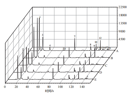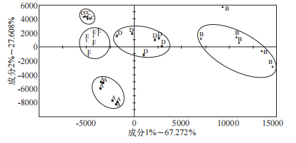 對不同地區生乳進行PCA分析,結果如圖4所示。在PCA模型中,主成分貢獻率為(PC1:67.272%;PC2:27.608%),累計貢獻率能夠達到94.88%,因此主成分分析結果可以較好地代表樣品氣味信息。對其進行區分后,樣品中達拉特旗生乳樣品(B)與巴彥淖爾生乳樣品(A)、和林格爾生乳樣品(C)及寧夏生乳樣品(E)在以PC2為區分軸時區分開,達拉特旗生乳樣品(B)在以PC2為區分軸時距離相對較遠,和林格爾生乳樣品(C)、涼城生乳樣品(D)及寧夏生乳樣品(E)與巴彥淖爾生乳樣品(A)以PC1軸作為區分。結果表明PCA分析能夠較好區分生乳氣味信息。
