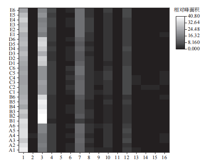 通過電子鼻對不同地區生乳進行檢測,生乳氣味指紋圖譜,如圖1所示。對各地區指紋圖譜進行對比分析后,發現生乳氣味指紋圖譜中共檢出16個共有峰,不同地區生乳樣品峰的數量幾乎沒有差異,,結合16個特征峰相對峰面積熱圖(圖2)分析,不同地區生乳特征峰基本相同,但特征峰含量有明顯區別。