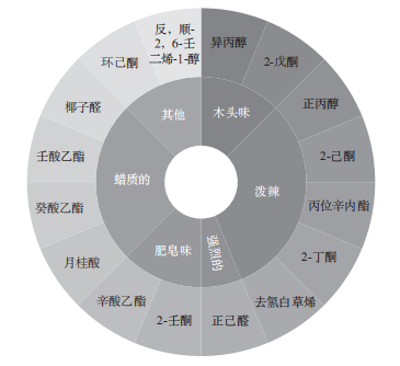 圖3 生乳氣味特征成分(外圈)和主觀感知類別(內圈)的氣味輪