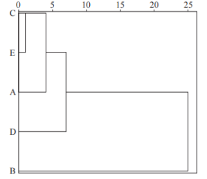 為初步判定峰面積較大的異丙醇、2-丁酮和環己酮含量對生乳地區歸屬的影響,以生乳中檢測的相關含量為變量,歐式距離平方為度量標準,通過組間平均數聯結法完成聚類分析,結果如圖5所示。其中,和林格爾生乳樣品(C)與寧夏生乳樣品(E)先聚為一類,此類生乳異丙醇、2-丁酮和環己酮含量相對偏低,再與巴彥淖爾生乳樣品(A)聚為一類后與涼城生乳樣品(D)聚為一類,最后與達拉特旗生乳樣品(B)聚類,達拉特旗生乳樣品的各物質含量較高。