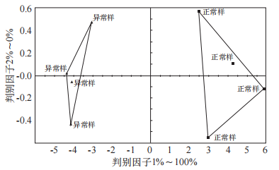 對生乳進行DFA分析,結果如圖9所示,圖中橫、縱坐標判別因子1、2累積區分指數達到100%,2種樣品未出現重合部分,且相距較遠。8批生乳樣品均能得到有效分離,所有樣品按其性質分為2類,結果表明,通過DFA能夠快速、有效地區分生乳和異常乳樣品,且區分效果良好。