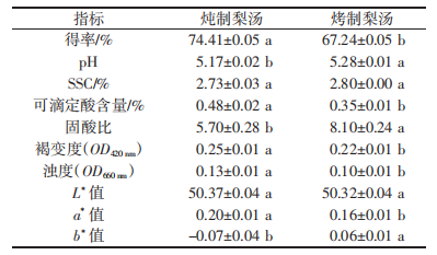 由表2可知,烤制雪花梨湯可滴定酸含量和濁度較低,pH和固酸比較高(P<0.05);燉制梨湯得率、可滴定酸含量和濁度較高,固酸比較?。≒<0.05)。兩種梨湯的SSC和L*值均無顯著性差異;色澤方面,燉制梨湯色澤較為鮮亮,烤制梨湯的褐變度和a*值較小。