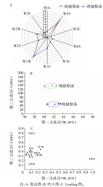 由圖1A可知,兩種梨湯在10種傳感器上的響應各異,在W5S、W1W和W2W傳感器上的響應值較大。由圖1B的PCA結果顯示,第一主成分(PC1)和第二主成分(PC2)的貢獻率分別為96.16%和3.04%,總貢獻率為99.20%,充分涵蓋了兩種梨湯樣品的主要信息,燉制梨湯和烤制梨湯能夠完全分離,說明其氣味具有明顯差異。Loading分析可用于判斷各傳感器對樣品的區分能力,各傳感器在某主成分軸上的特征向量絕對值越大,表示該傳感器對此主成分的貢獻率越大。由圖1C可知,傳感器W5S對樣品區分能力最佳,其次為W1W、W2W、W1S和W2S,其中W5S對第一主成分貢獻率最大,W1S對第二主成分貢獻率最大。