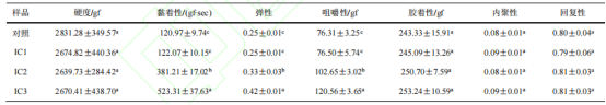 如表3所示,IC1組與對照組在硬度、黏著性、彈性、咀嚼性、膠著性、內聚性和回復性特性方面均無顯著差異(P>0.05),說明添加香精對冰淇淋的質構無顯著影響。而IC2組和IC3組的硬度略有降低,但差異不顯著,其黏著性、彈性和咀嚼性顯著高于對照組。黏著性、彈性和咀嚼性的提高說明添加芒果粉增強了冰淇淋在受力擠壓后的回彈能力,并增加了冰淇淋在口腔中的咀嚼次數,延長了口腔中芒果和牛奶味道的感知時間,有利于提高口腔對于芒果和牛奶味道的感知,同時也會賦予冰淇淋以更光滑的口感。而在膠著性、內聚性和回復性方面,IC2組和IC3組冰淇淋與對照組間無顯著差異(P>0.05)。