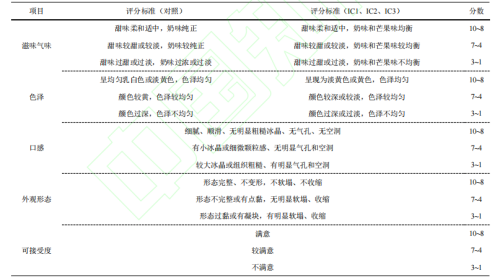 小組成員共10人,由接受培訓的研究生組成,從滋味氣味、口感、色澤、外觀和總體可接受度等5個方面來評價4種冰淇淋品質。詳細評價標準見表4。