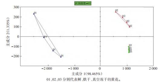 圖1為不同處理方式下的黃花主成分分析。由圖1可知,第一主成分和第二主成分的總貢獻率達到了99.800%,識別指數是93,可以收集特征信息。不同處理的黃花樣品分別聚類在圖中的不同區域,相互之間能夠較好地區分。