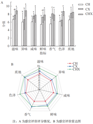 3種食用菌素肉排人工感官評價評分情況如圖3A所示。結合人工感官評價雷達圖(圖3B)分析樣品整體感官評分情況。海鮮菇素肉排整體感官評分優于其他兩種,所有指標平均分值均在 7~10 分;其次為香菇素肉排,在質地、滋味、咸味、鮮味方面的評分略遜于海鮮菇素肉排,存在輕微苦澀味,且色澤不佳;而猴頭菇素肉排整體感官評分均低于其他樣品,各指標平均分值均低于7分。