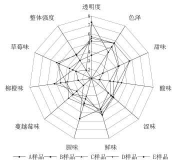這5款膠原蛋白肽固體飲料在風味特征上主要歸納為以下4類屬性,即口感、果味、外觀及整體強度,其中口感具體表現為酸、甜、澀、鮮和腥,氣味具體表現為草莓味、柳橙味、蔓越莓味等。由表2、圖1可知,這5款樣品在上述屬性上各有特點。①口感:E和D樣品的酸甜味最強,腥味最弱;C樣品酸甜味適中,澀味最強;A樣品腥味最強,甜酸澀味最弱;B樣品的腥味適中,其他味較弱。②果味:B樣品表現出明顯的柳橙味,蔓越莓味和草莓味稍帶適中;C樣品則表現出明顯的蔓越莓味,柳橙味和草莓味稍帶適中;D和E樣品表現出明顯的草莓味,柳橙味和蔓越莓味稍帶適中;A樣品相比較于其他膠原蛋白固體飲料,帶有的果味最弱。③外觀:A樣品的透明度最強,色澤最弱;B樣品的透明度最弱,色澤較弱;C、D和E的色澤相近,透明度適中。④整體強度:D和E樣品的整體口感和風味度最強,其次是B和C樣品,最弱是A樣品。說明添加了果粉的膠原蛋白肽固體飲料在色澤、滋味和氣味方面更豐富。