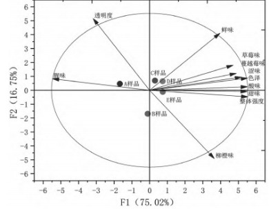 本研究對不同果味的膠原蛋白肽固體飲料的透明度、色澤、甜味、酸味、澀味、鮮味、腥味、蔓越莓味、柳橙味、草莓味和整體強度進行了主成分分析,當提取到2個主成分,累積的方差貢獻率達到91.77%,說明這2個主成分可以涵蓋不同果味膠原蛋白固體飲料的大部分信息。如圖2所示,不同果味膠原蛋白固體飲料分散在各個區域,兩點之間距離越長,說明兩個樣品的整體感官品質差異越大;同時兩點距離越短,說明兩個樣品間感官品質含量差異越小,感官品質較為相近。從PCA圖中,可以直觀地看到5款樣品的感官屬性各具特點。其中A樣品與其他樣品差異最大,故分布于F1的負半軸,風味特征主要表現為腥味強、透明度高,其他感官屬性不明顯。B樣品的風味特點主要為柳橙味比較強,故分布在F2的負半軸;C、D和E樣品分布距離比較近,其特征表現為透明度、色澤和甜度等感官屬性比較接近。