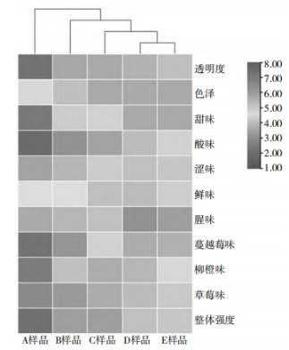 對不同果味膠原蛋白肽固體飲料的感官屬性強度進行熱圖聚類分析的結果見圖3。5種樣品大致可分為3類,即C、D和E最先聚為一類,其透明度、色澤和甜味等方面的感官性質較為相似,說明蔓越莓味和草莓味在感官上整體相似;第二類為B樣品,其柳橙味和色澤較為突出;第三類為A樣品,其在透明度表現最突出,這與主成分分析呈現了相同結果。同時發現A樣品為純膠原蛋白肽粉呈現出的腥味較濃,而B、C、D、E這4款膠原蛋白肽固體飲料樣品腥味較淡,這4款產品配方中添加了果粉,說明果粉有效掩蓋了膠原蛋白肽的腥味。