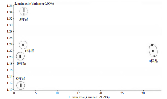 利用電子鼻對5種不同果味膠原蛋白肽固體飲料的揮發性成分進行測定后,將采集得到的數據進行主成分分析,分析結果如圖4所示。第1和第2主成分的累積貢獻率達到99.99%,說明電子鼻對其揮發性成分表現出較高的識別度和靈敏度。總體看,各樣品的揮發性成分有各自的分布位置,基本沒有重合,說明電子鼻對于5種樣品氣味的區分度總體較好,所有樣品的風味相對獨立,原因可能是因為不同果味膠原蛋白肽固體飲料的配方組成存在一定差異,所以在不同果味膠原蛋白肽固體飲料形成的揮發性成分亦有所不同。C、D和E樣品在第1主成分上的相距較近,但在第2主成分上能完全區分開,說明草莓味和蔓越莓味的膠原蛋白肽固體飲料的氣味上略有相似,而B樣品在第1主成分上與其他樣品相聚甚遠,說明柳橙味的膠原蛋白肽固體飲料氣味與其他樣品差異最為明顯。根據感官結果發現A樣品在氣味上主要呈現腥味,B樣品為柳橙味的膠原蛋白肽固體飲料與A樣品在氣味上相差甚遠,從電子鼻分析結果得出,柳橙味的果粉相比較蔓越莓和草莓味的果粉的掩腥效果更好。