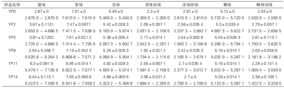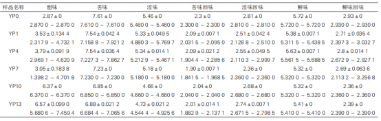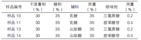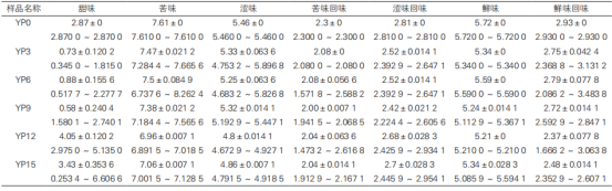 表1  三氯蔗糖與輔料矯味組合味覺信息測定值的均值 ± 標準差、95% 置信區(qū)間表2甜菊糖苷與輔料矯味組合味覺信息測定值的均值 ± 標準差、95% 置信區(qū)間表3阿斯巴甜與輔料矯味組合味覺信息測定值的均值 ± 標準差、95% 置信區(qū)間根據表1~3,選出甜味、鮮味、鮮味回味較高值的樣品,苦味、苦味回味、澀味、澀味回味較低值的樣品,即選出樣品 10、11、13、14 共 4 個樣品作為進一步研究的對象,篩選結果見表4。