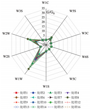 圖1是基于電子鼻技術對山櫻花16個處理的櫻花香氣組成成分響應值構建的雷達圖。從圖1可以看出,10個傳感器對櫻花香氣組分的響應存在顯著差異(P<0.01),響應值‘G/G0值’分布于0.9~29之間。W1C、W5S、W1S、W1W、W2W和W3S傳感器對櫻花香氣組分響應值較大,響應值從高到低依次為W1W、W2W、W5S、W1S、W3S、W1C,其余傳感器對櫻花香氣組分響應值較小(G/G0值≈1)。因此,優選出W1C、W5S、W1S、W1W、W2W和W3S傳感器進行數據提取與分析。