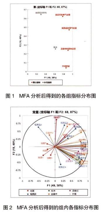 在 Asselin 等的研究中,數據來自 36個感官評估專家對 21種白酒進行的評價,有 31個指標信息,其中包括2個地理信息定性指標、5個品嘗后的香氣定量指標、3個外觀定量指標、10個搖晃后的香氣定量指標、9個品嘗中的香味定量指標、2個排序指標,該數據通過 XLSTAT 中的 Multiple Factor Analysis 將第一組和最后-組的指標作為 supplementary tables,得到產品及指標的投影地圖(prjective mapping)。如圖1所示,得到6組指標的分布情況,將指標分為現行指標( Active)和補充指標( Supplementary)展示在投影地圖上,能夠看到各指標之間的距離及關系。