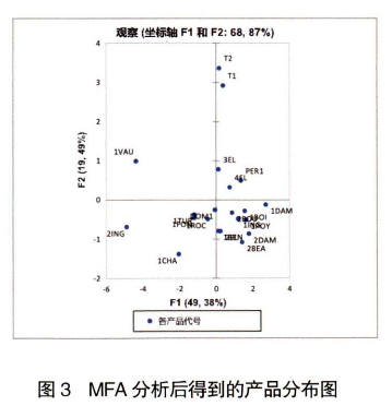 MFA是用來分析和總結具有復雜結構和多元來源的多元數據統計方法,常用于食品、化妝品等感官分析中。MFA同主成分分析(principlComponent analysis,PCA)有緊密聯系,能夠運用多組多維數據上的主成分分析。主成分分析通過正交變換將多個變量轉換成少數幾個線性不相關變量,達到降維目的。