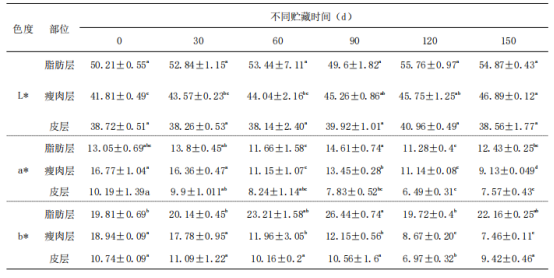食品品質中色澤是最直觀展現的指標。采用色差測試中的L*、a*、b*數值對貯藏過程中紅燒肉的色澤進行評價。由表1可以看到:脂肪層L*值和b*值0~150d沒有顯著變化,a*值呈現上下波動的趨勢,這可能與紅燒肉醬汁的滲透不均勻以及脂肪的氧化有關;瘦肉層L*值呈現逐漸上升的趨勢,其中150d與前三個貯藏期有顯著變化(P<0.05),90d和120d均與新鮮的比較有顯著變化(P<0.05),經過凍藏后,紅燒肉的亮度提升,但a*和b*值逐漸下降,表明瘦肉層的紅黃色澤逐漸褪去;皮層L*、a*、b*值變化不顯著(P>0.05),色澤實驗表明凍藏150d后,紅燒肉仍保持較好的亮度,但是紅黃色澤有所降低,這可能是由于紅燒肉醬汁的滲透和脂肪的氧化有關。