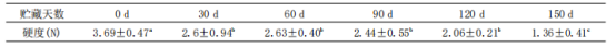 由表2可知,隨著凍藏時間的延長,紅燒肉的硬度持續降低,其中30d凍藏與新鮮的紅燒肉有顯著變化(P<0.05),30d至90d無顯著變化(P>0.05),而貯藏120d和150d與此前均有顯著變化(P<0.05)。凍藏30d,紅燒肉的硬度即明顯下降,凍藏150d自然解凍后的紅燒肉硬度下降至1.36N,這可能是因為凍藏過程中冰晶對肌細胞和肌肉纖維的破壞程度加重,引起豬肉中結合水和不易流動水的遷移與損失,從而引起紅燒肉質構品質發生劣變。