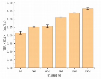 過氧化值是反映油脂氧化的重要指標,不同貯藏期的POV值如圖1所示。在-18℃條件下,預制紅燒肉的過氧化值隨貯藏時間增加而增長,其中只有60d和150d有明顯增加。不同貯藏時期的TBA反應物值如圖2所示,TBA值隨貯藏時間顯著上升(P<0.05),貯藏0d的MDA含量約為1.07mg/kg,貯藏150d后,MDA含量增加到1.75mg/kg,這是因為過氧化物的不穩定性質會進一步的分解為二次氧化產物如丙二醛。但預制紅燒肉在-18℃條件凍藏150d的過氧化值和丙二醛含量均低于GB10146—2015的限制量,仍保持在安全的范圍內。