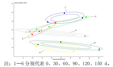 采用主成分PCA分析法,對新鮮紅燒肉至150d凍藏周期的PCA分析結果見圖4。新鮮紅燒肉至90d凍藏周期均有相交或重疊的部分,而與120d和150d凍藏的沒有相交部分,表明新鮮,30、60、90d凍藏紅燒肉的氣味不能顯著地區分開,而120d和150d凍藏的與前面的香氣組分能顯著區分,有所衰減。說明了紅燒肉氣味隨凍藏時間的延長,前期變化小,而120d后風味有所衰減,但衰減程度不大。