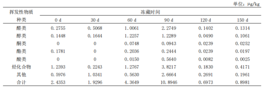 新鮮紅燒肉至150d揮發性物質分別為57種、72種、49種、60種、66種、57種。整個貯藏期醛類物質和酸類物質種類數量先增加再減少,醇類、烴化合物和其他類揮發性物質數量呈現先增多然后減少再增多的現象,酮類物質種類數量隨時間增加。但各個貯藏期各類揮發性物質的含量呈現先上升再下降的現象,其中120d起于之后的兩個貯藏期相比揮發性物質含量有較大的降低,表明氣味隨凍藏時間的延長,前期變化小,而120d后風味有所衰減,但衰減程度不大,對整體風味品質影響不大。