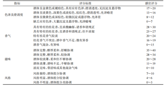 采用10人打分制。借鑒GB/T27588—2011《露酒》的標準,對不同桂花酒的色澤、澄清度、香氣、滋味以及風格指標進行綜合評分。按照表1感官評分標準進行評分(滿分100分)。評分以各項指標總分的平均分表示。