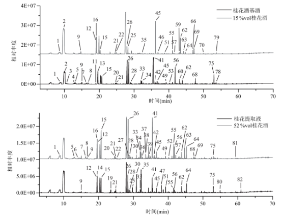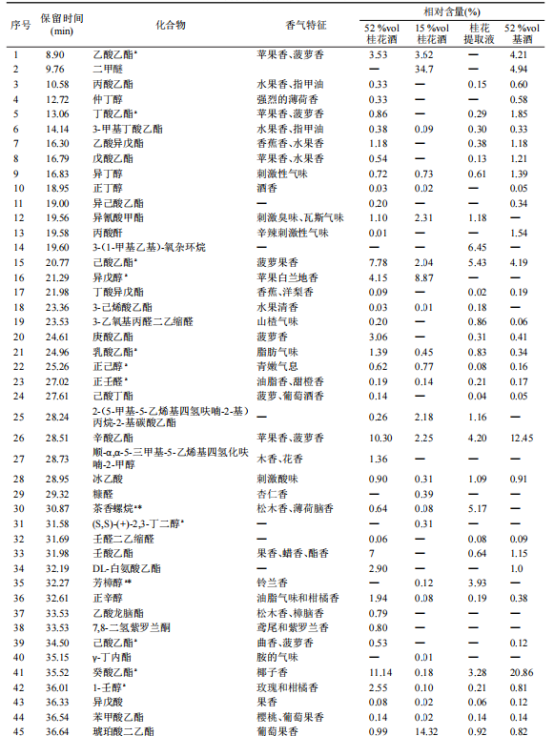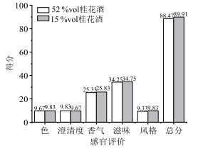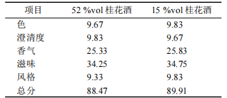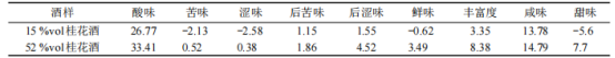 將自制52%vol桂花酒與市售15%vol桂花酒進行人工感官對比評定,取平均分,結果見表2。由表2可看出,自制52%vol桂花酒在澄清度及酒體豐富度方面表現更好,市售15%vol桂花酒的香氣與滋味得分較高,且酒體風格更具優勢,說明52%vol桂花酒香味更加豐富飽滿,15%vol桂花酒的桂花風格更加典型。