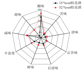 15%vol市售桂花酒與自制52%vol桂花酒經過電子舌滋味分析系統檢測后,結果如圖2和表3所示。由表5可知,自制桂花酒在酸味、咸味方面非常突出,有飽滿的豐富度,可明顯感知鮮味和后澀味,在苦味、澀味及后苦味方面感覺較弱;市售桂花酒除了在酸味、咸味方面非常突出,豐富度不如自制桂花酒飽滿,后苦及后澀味感覺較弱,且基本察覺不出苦味、澀味及鮮味,與不同桂花酒的感官評價較一致。