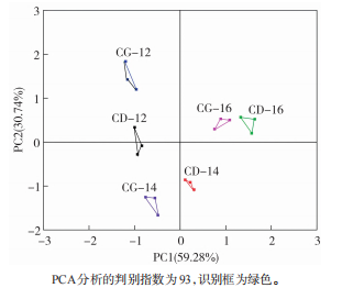 對樣品的電子眼數(shù)據(jù)進行PCA分析,結(jié)果如圖2a所示。可以看出,主成分1(PC1)、主成分2(PC2)和主成分3(PC3)之和達到了82.71%,可代表樣品的絕大部分信息。同時,判別指數(shù)是用來表征樣品之間區(qū)分度大小的一種判斷方法。本實驗中煙葉顏色的判別指數(shù)(評價選定目標的判別質(zhì)量)為100,說明通過電子眼能有效區(qū)分不同包裝樣品的顏色差異,且存在一定可靠性。另外,不同樣品各自聚在一起,說明在不同包裝和醇化時間下樣品顏色分布均存在明顯差異。基于歐氏距離可以判斷不同處理間樣品差異程度。圖2b中CD-12、CD-14、CD-16、CG-12和CG-14處理聚為一組,說明其顏色存在一定相似性;而CG-16處理與其他處理距離最遠,說明其顏色與其他樣品差異最大。故從煙葉顏色看,充氮包裝處理在一定程度上延緩了醇化過程煙葉顏色的褐變加深。